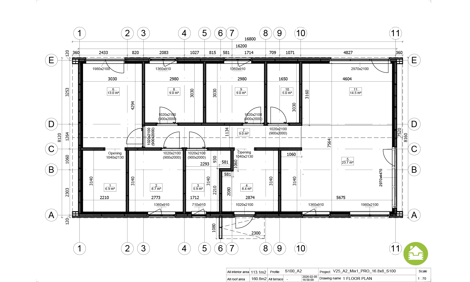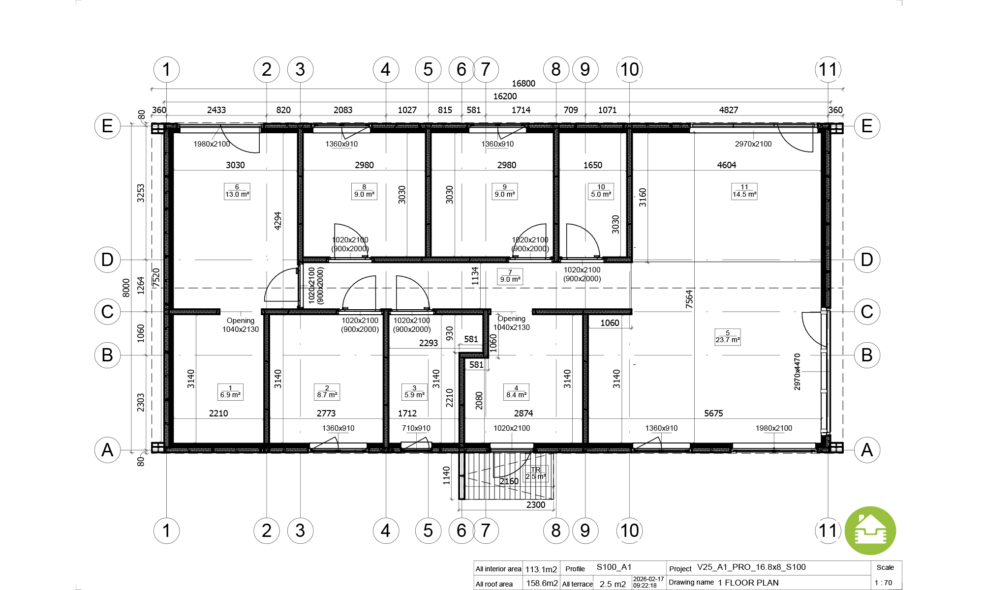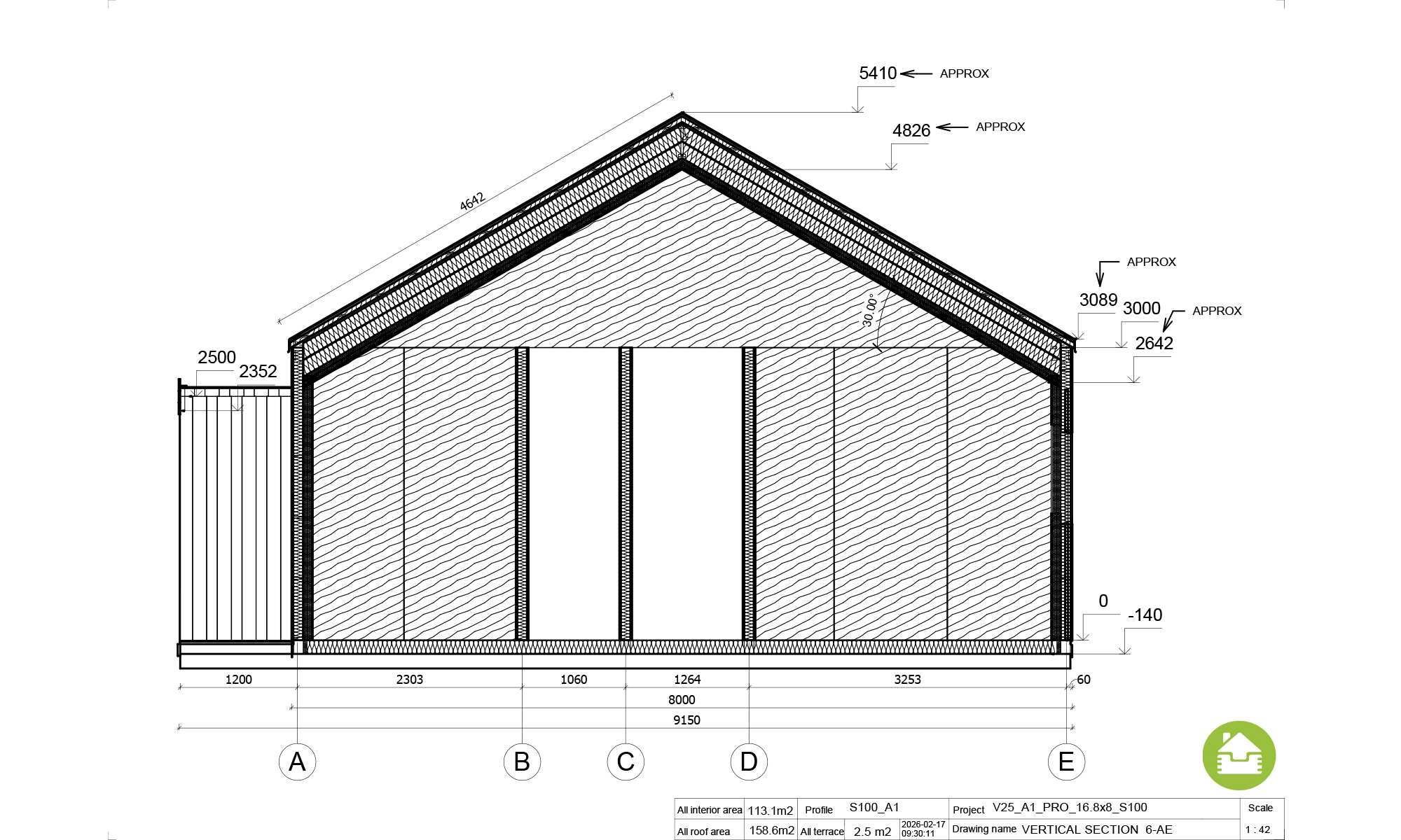 Maison familiale de 113 m² avec 5 pièces et 2 WC, en format 17 × 8 m et pente de toit 30°. Pack PREMIUM PRO (RE2020).