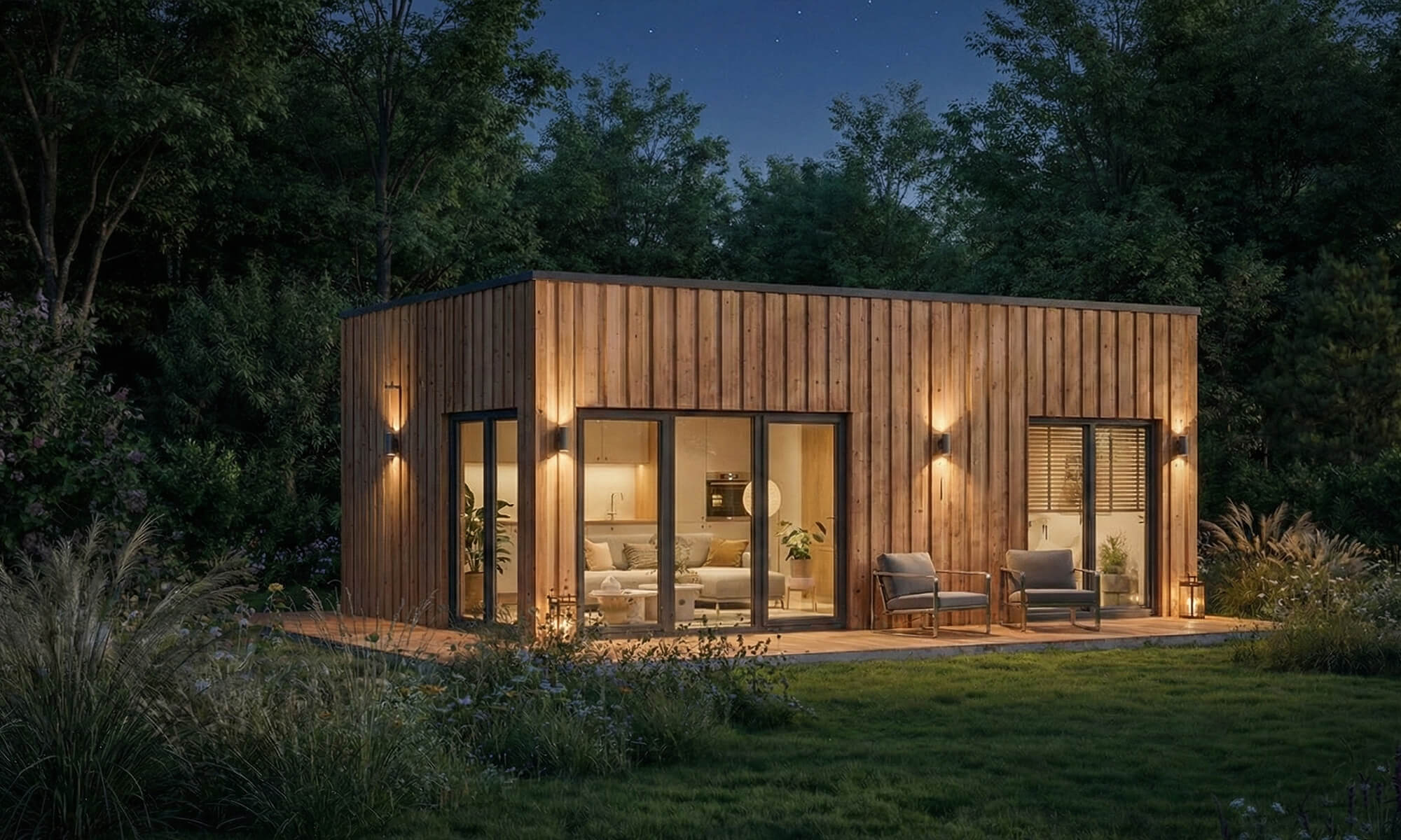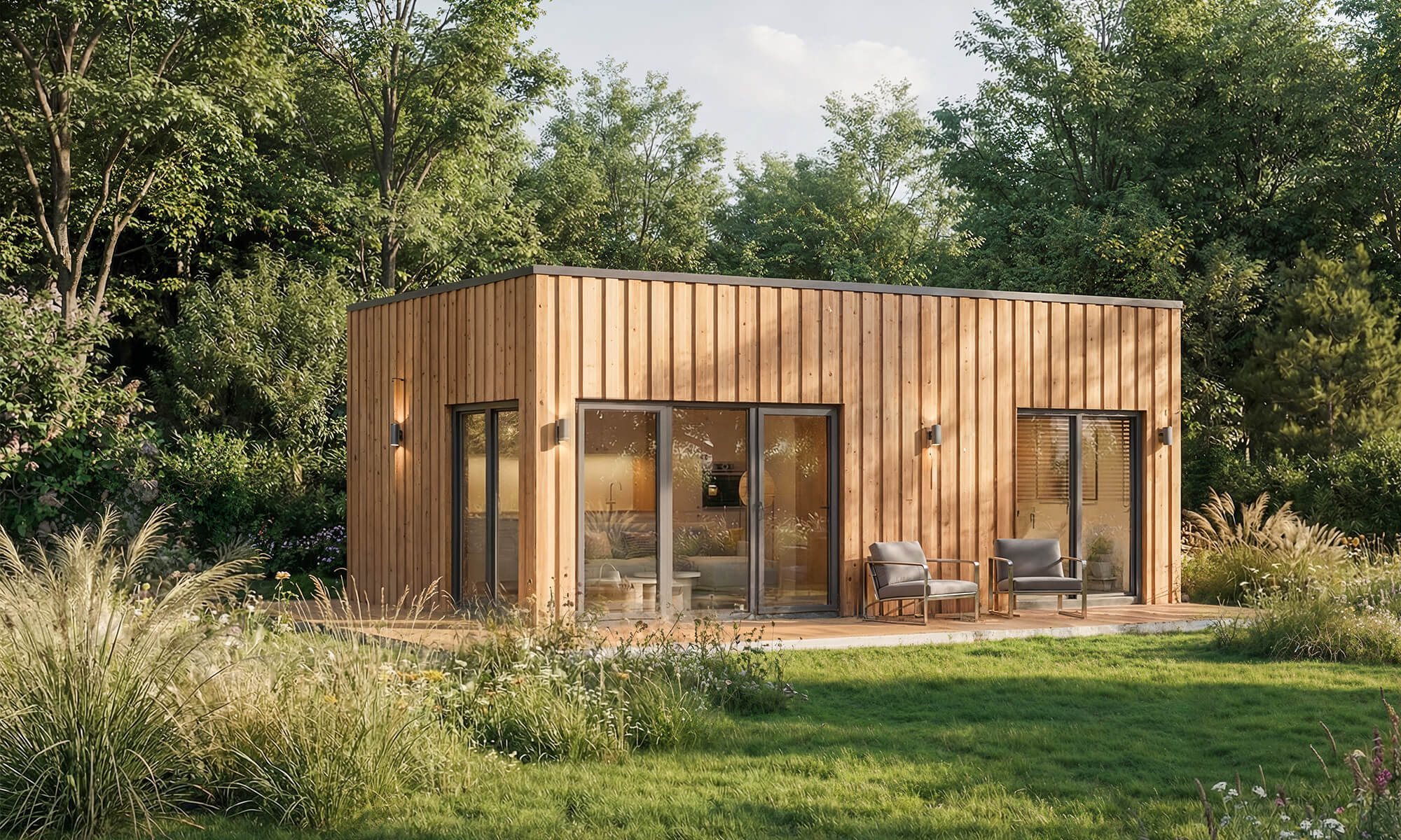 Ce n’est pas un simple abri de jardin, mais une petite maison en bois habitable, pensée pour le confort et la location.