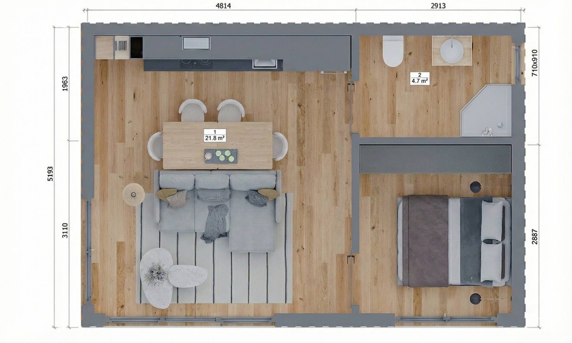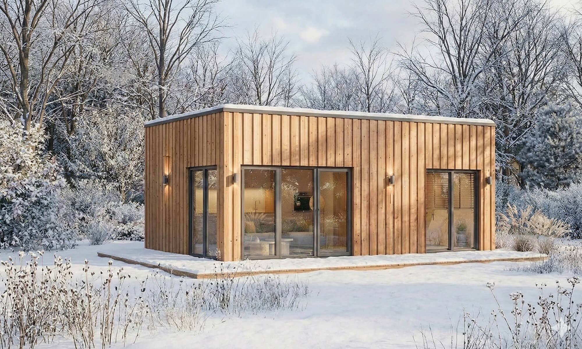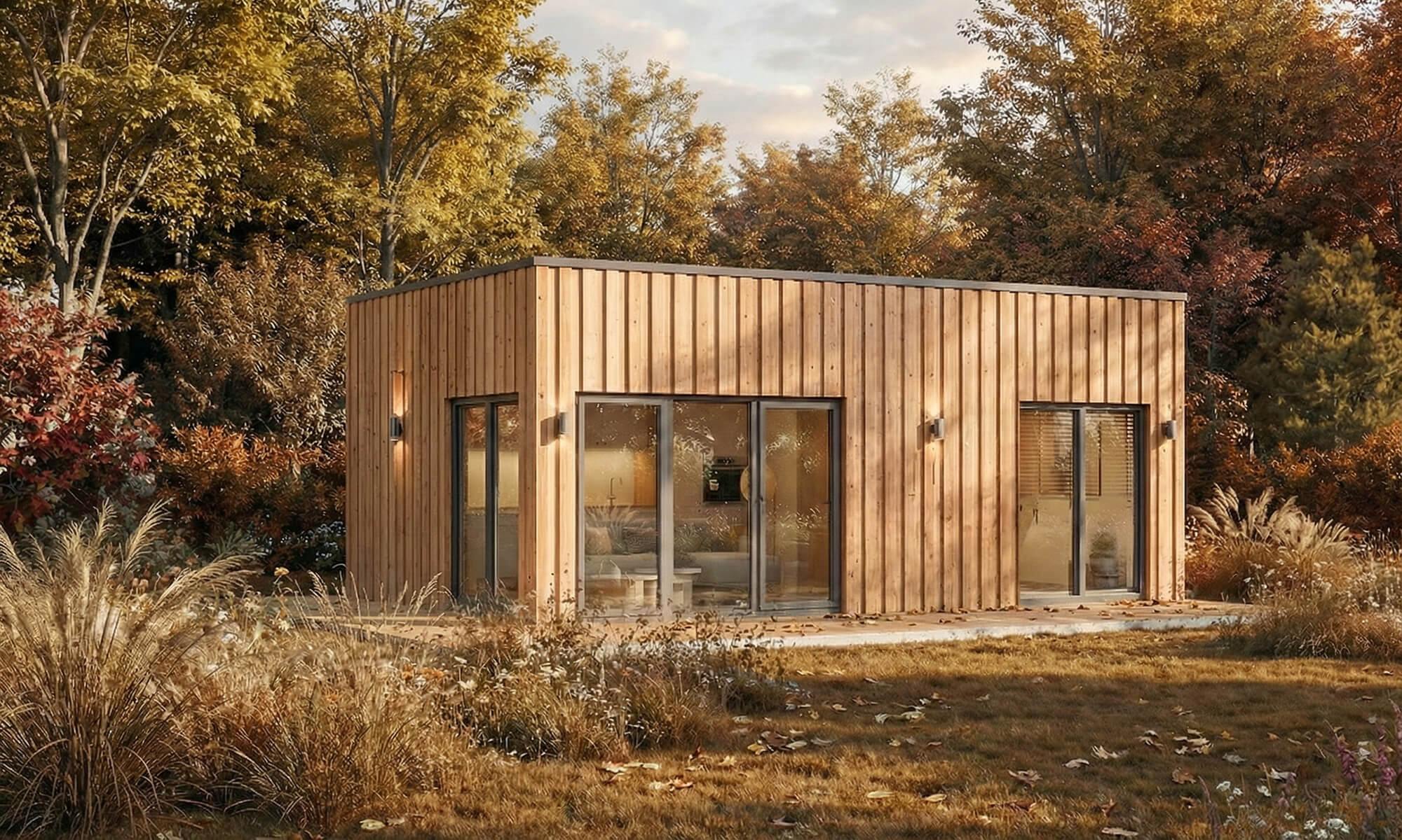 La maison bois 34 m² V15_A1 est une petite maison ossature bois RE2020, très bien isolée, idéale comme résidence secondaire confortable ou comme chalet locatif (Airbnb, gîte, location saisonnière) sur votre terrain en France.