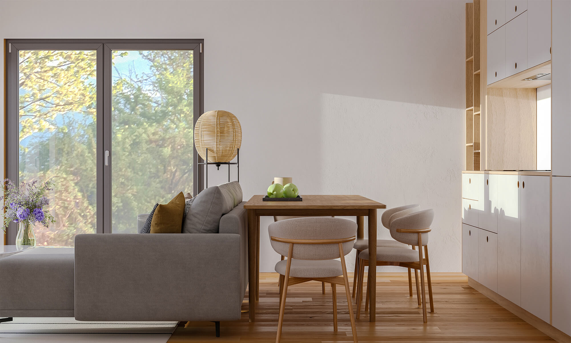 Menuiseries PVC avec triple vitrage (Ug basse) pour un bon confort thermique.