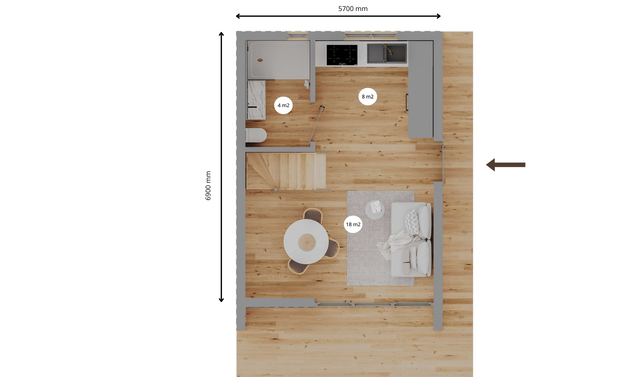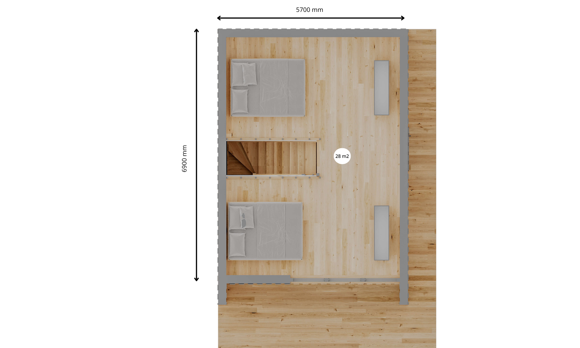 Agencement optimisé – Le rez-de-chaussée accueille un salon ouvert avec cuisine, une salle de bains fonctionnelle et une zone repas. L’étage propose une grande mezzanine de 28 m² offrant deux espaces nuit confortables.