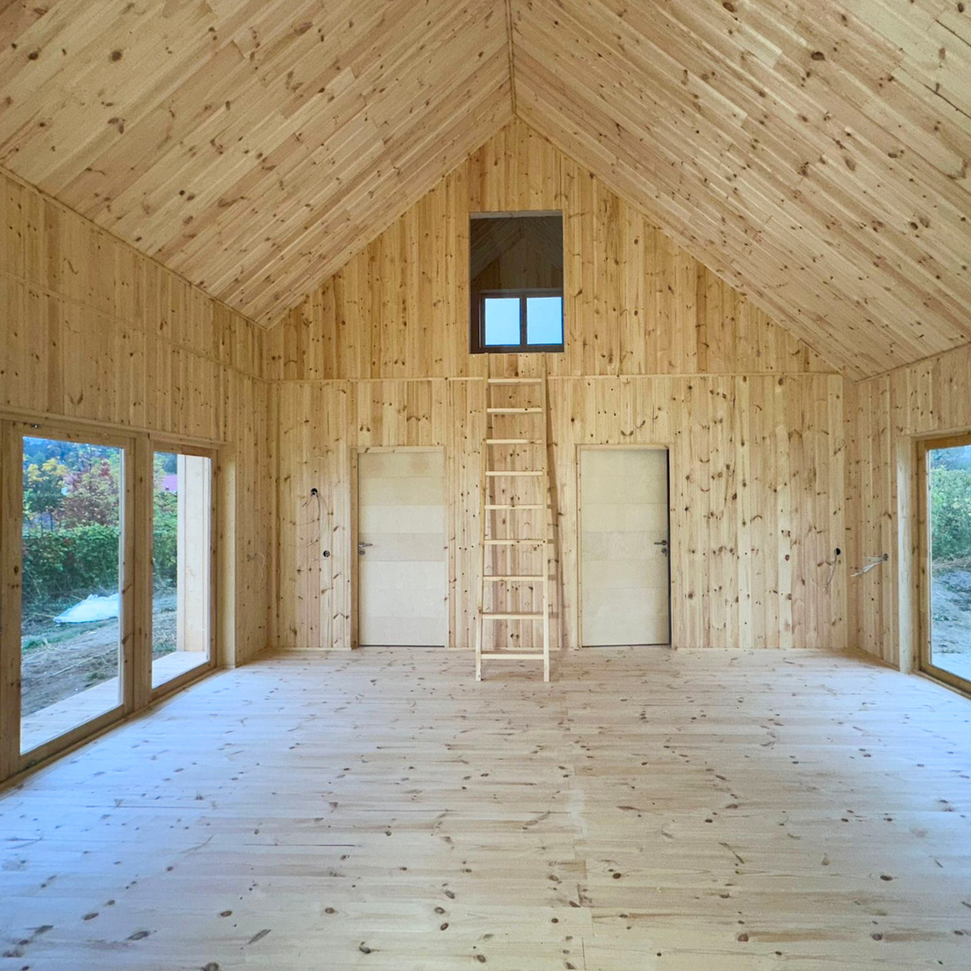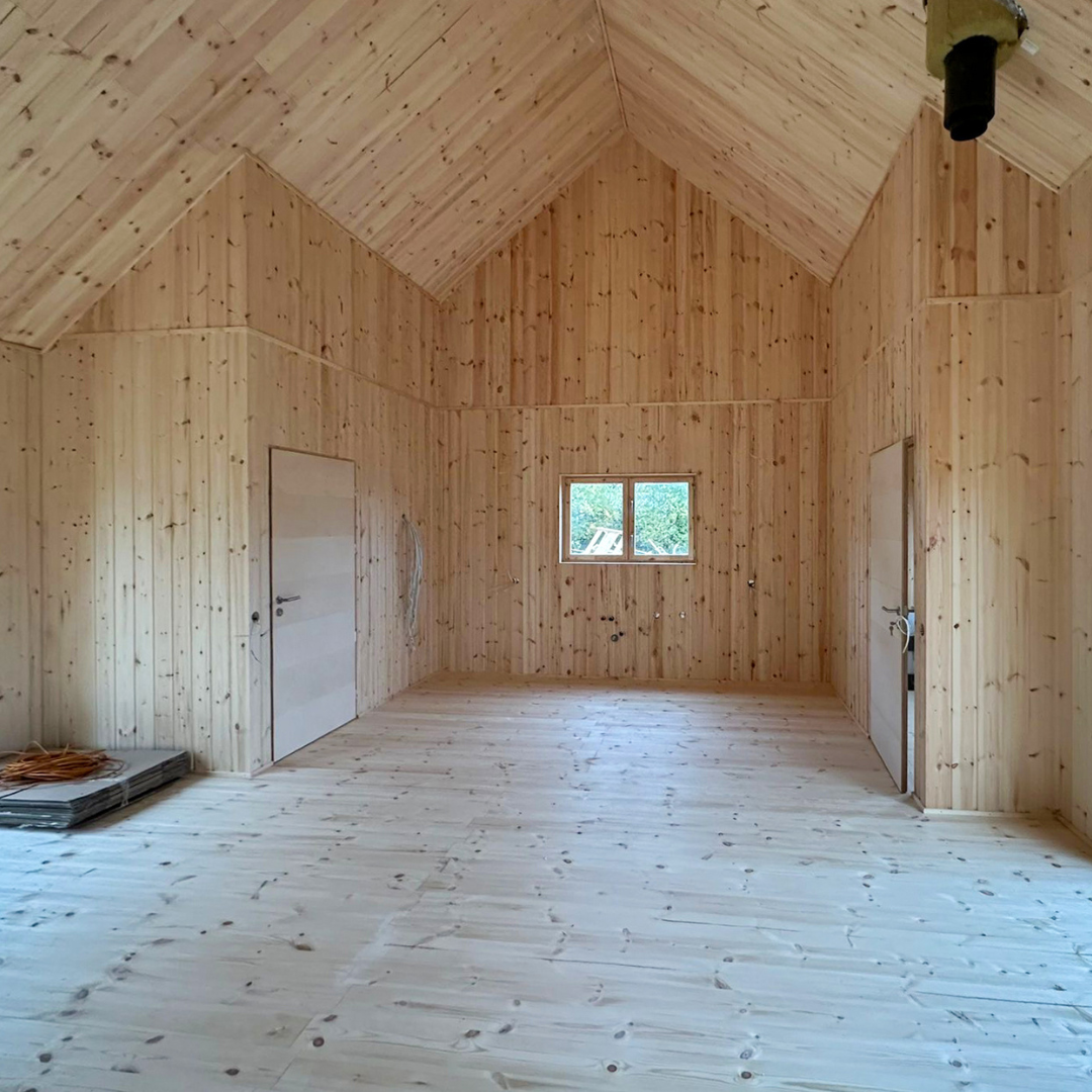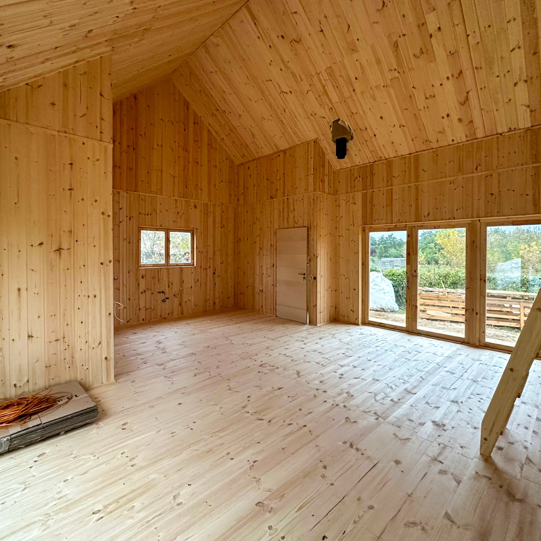 Pour l’aménagement intérieur, des lambris en bois massif ont été utilisés sur les murs, le plafond et le sol. Ce choix crée une atmosphère chaleureuse, naturelle et apaisante. Le bois régule naturellement l’humidité, assurant un climat intérieur agréable toute l’année.