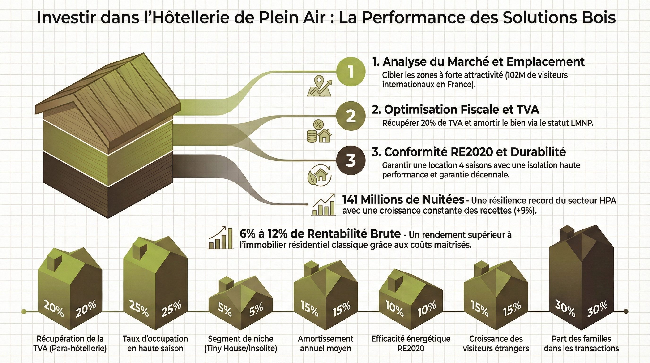 • Retour sur investissement (ROI) : Notre équipe vous aide à optimiser les modèles choisis afin d'atteindre une rentabilité locative maximale. De l'ajout de couchages supplémentaires aux différentes configurations de terrasses, chaque mètre carré est pensé pour augmenter vos bénéfices.